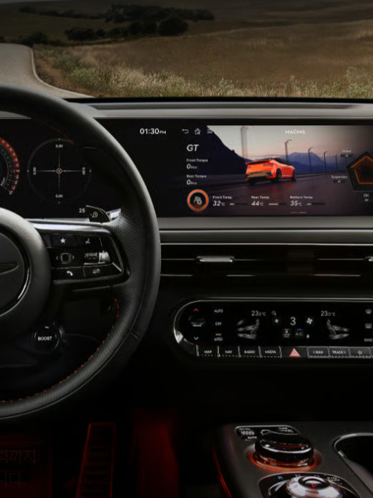 GV60 Magma는 끓어오를 듯 강렬한 퍼포먼스의 감각과 흐르듯이 뻗어나가는 우아한 주행감을 함께 안고 달립니다.고성능 배터리 제어와 고출력 모터로 폭발적이면서도 완성도 높은 고속 주행을 구현하고,마그마 전용 서스펜션이 제공하는 탁월한 노면 접지력으로 장거리 주행에 안정감과 여유를 더합니다.